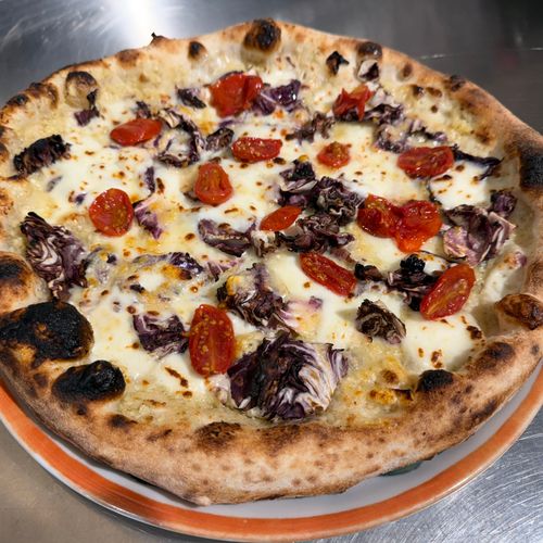 Ingredienti: carciofi in olio a spicchi ,radicchio,mozzarella,grana(in cottura), Datterino rosso semi dry