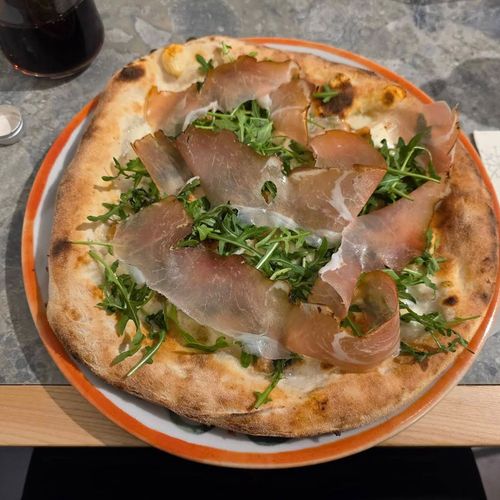 Ingredienti: Salsa di pomodoro, mozzarella, rucola, prosciutto crudo, parmigiano a scaglie