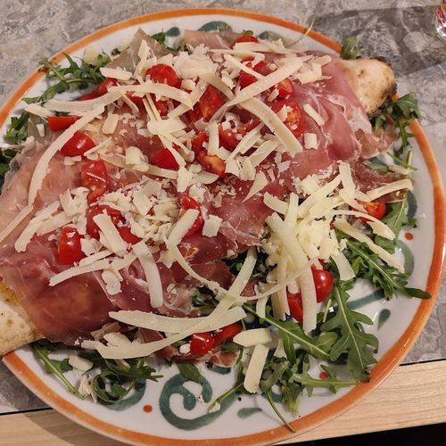 Ingredienti: Salsa di pomodoro, mozzarella, rucola, prosciutto crudo, datterino rosso, parmigiano a scaglie