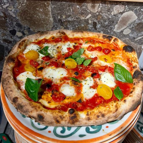 Ingredienti: Salsa di pomodoro, bufala,datterino giallo, pomodoro a bruschetta, basilico, olio d'aglio, pepe nero, origano